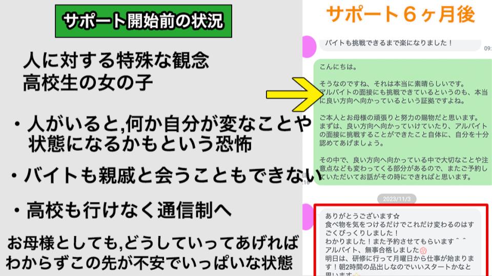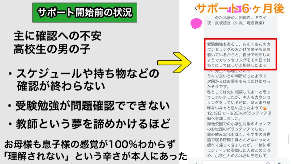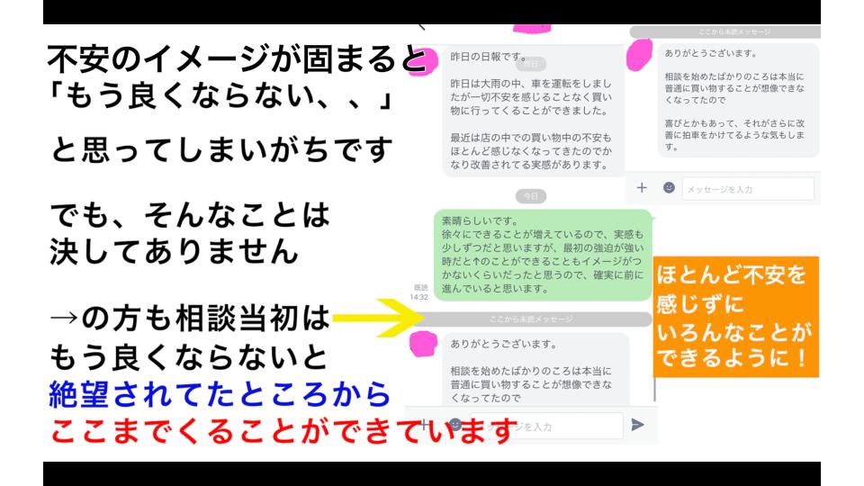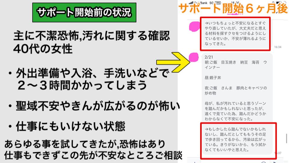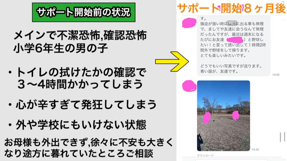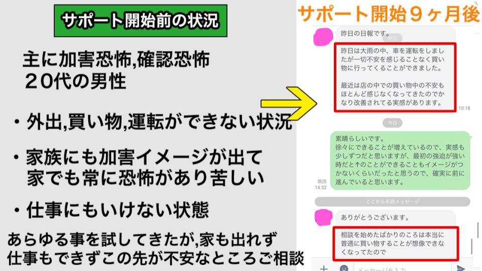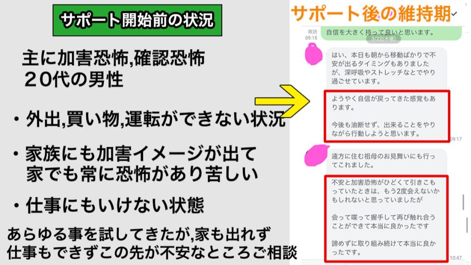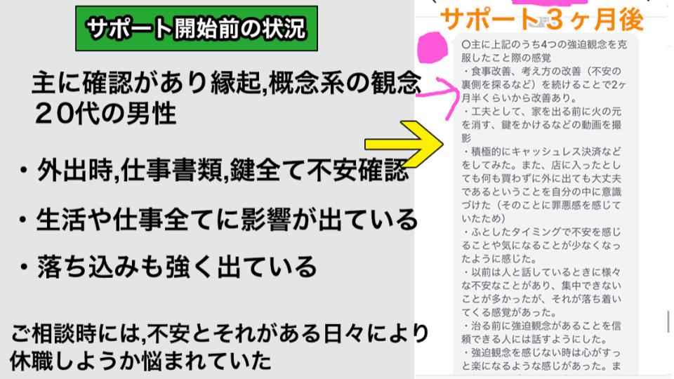 強迫観念があり、仕事も休職しうつ状態になっていたところから約9ヶ月で不安が気にならなくなり、無事仕事復帰できました!
